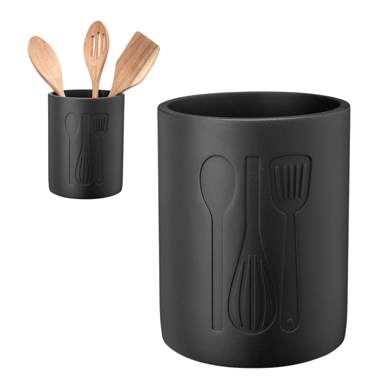 Elementy o kamiennym wyglądzie w kuchni to bardzo stylowa propozycja - linia akcesoriów kuchennych SANDY wykonana z polyresinu dopełni wnętrze modnym designem i wykończeniem wysokiej jakości. Prezentowany przybornik na akcesoria kuchenne SANDY jest nie tylko designerski, ale również bardzo praktyczny. Przybornik jest w klasycznym okrągłym kształcie. Zmieści wszelkie łyżki, chochelki i łopatki, które warto mieć zawsze pod ręką podczas gotowania potraw. Czarny, kamienny przybornik jest również ciężki, przez co stabilnie leży na kuchennym blacie.