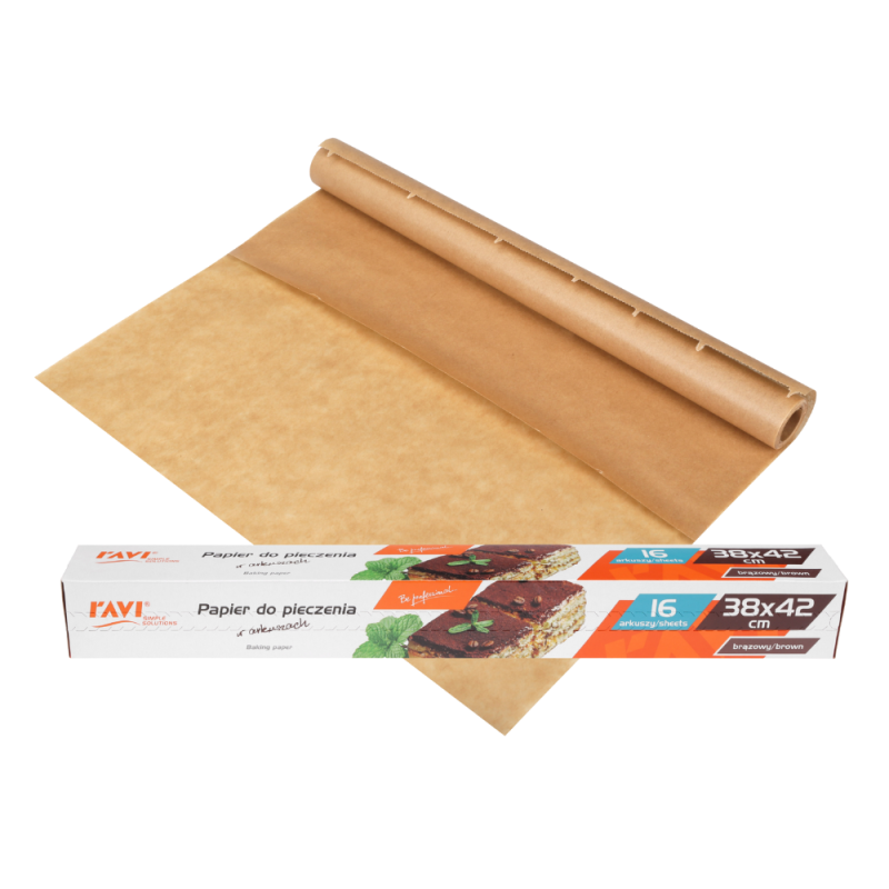 Brown, double-sided coated baking paper is designed primarily for baking—it prevents cakes from sticking to the baking sheet, burning, and makes it easier to keep baking pans clean. It is odorless and has excellent resistance to high temperatures—up to 220 degrees Celsius.