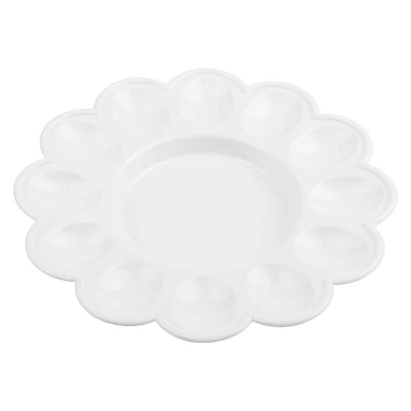 The plate has 12 appropriately shaped recesses for displaying eggs