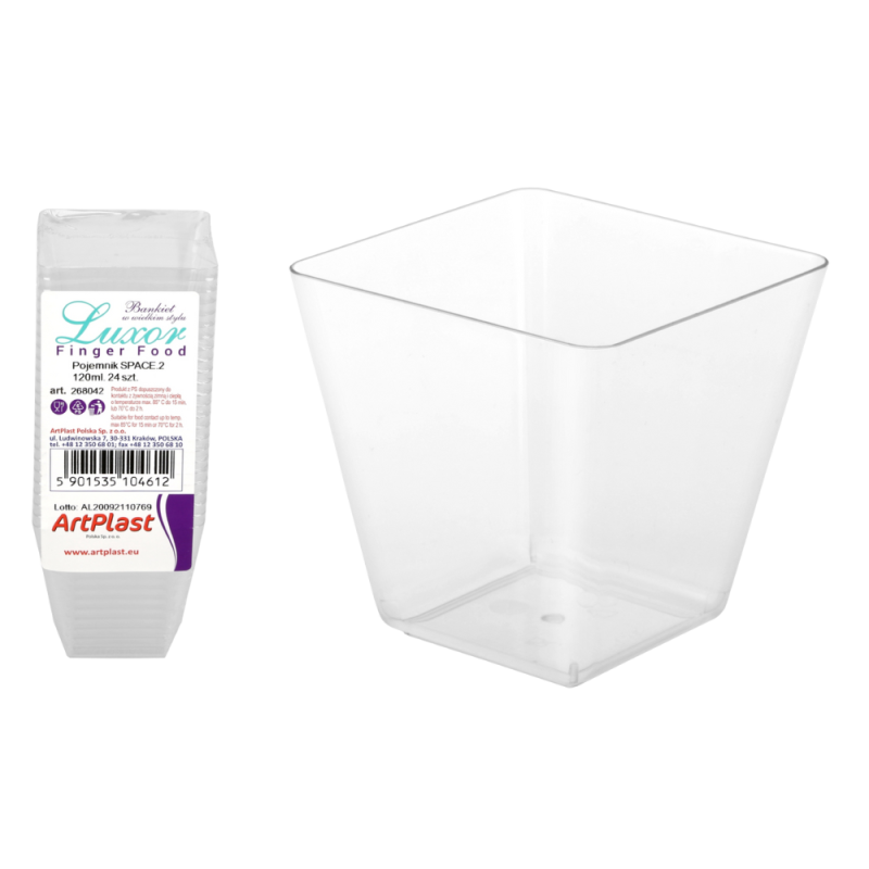 The Space 2 container is made of a transparent, glass-like material. A disposable container for mini-portions of snacks, desserts, and salads. It's perfect for business receptions, elegant banquets, weddings, tastings, birthdays, catering, or as a way to spice up a buffet.