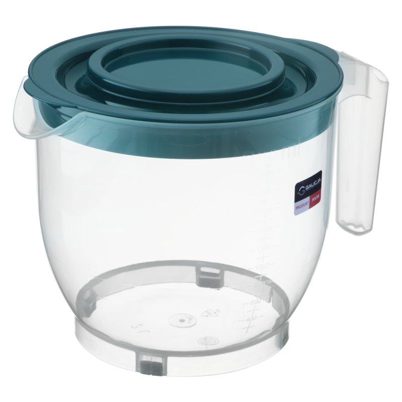 A mixing jug is an indispensable tool in any kitchen. Made of durable, transparent plastic , it allows for easy monitoring of the mixing process. Its turquoise lid not only adds an aesthetic touch but also serves a practical purpose – it can be easily removed to insert a blender or mixer . Thanks to the lid's special design , the mixture does not splatter during mixing , which helps keep the kitchen clean. Perfect for preparing cakes, creams, or smoothies, this jug combines convenience, functionality, and modern design.