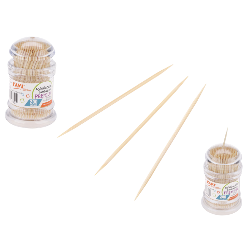 High-quality bamboo toothpicks placed in a practical plastic dispenser are indispensable for preparing and serving canapés and various types of snacks.